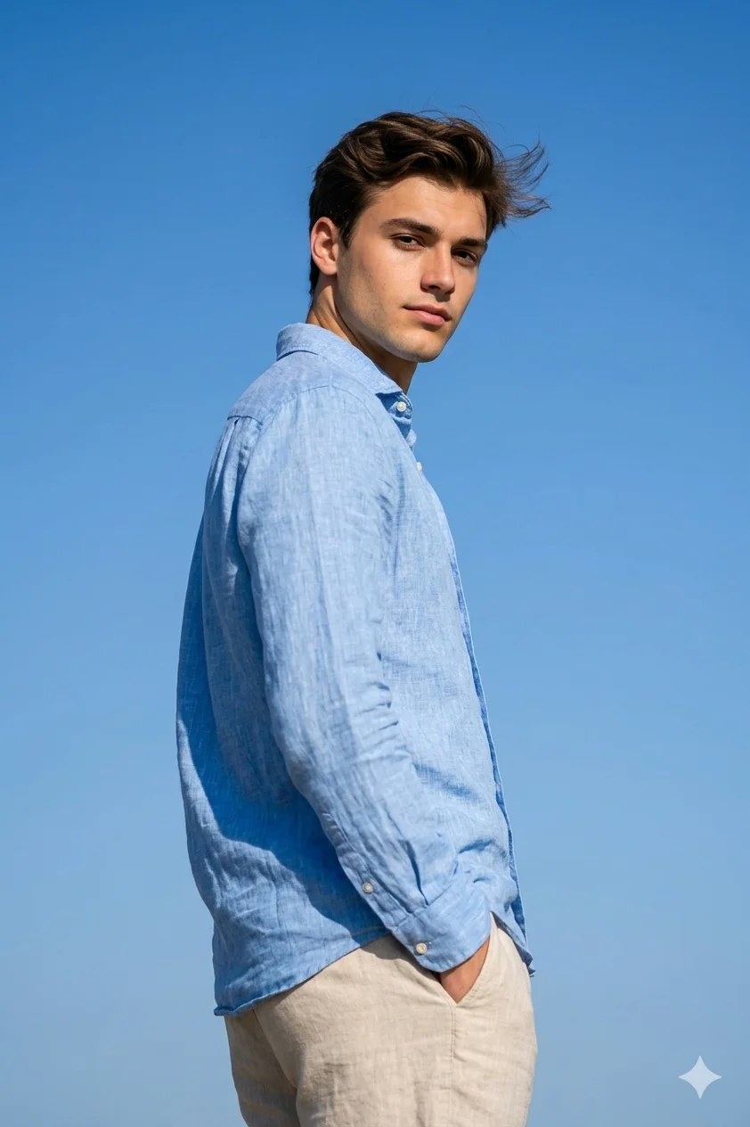 Enable strict facial consistency mode. Prioritize the facial features from the provided reference image. Do not alter the core facial structure. Maintain the subject's identity accurately. Subject: A man looking back over his shoulder at the camera. He wears a relaxed light blue linen long-sleeve shirt and beige linen pants, hands in pockets. Windblown hair. Environment: Bright natural sunlight, clear vibrant blue sky background. Style: Breezy, summer, minimalist aesthetic.
