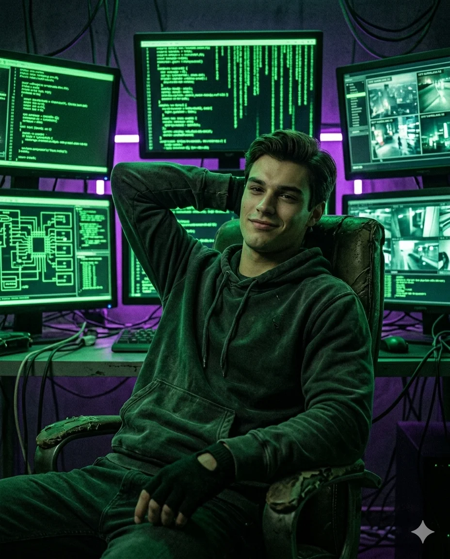 Gritty cyberpunk portrait of a man in a dark underground hacker workspace, surrounded by multiple glowing monitors displaying cascading green code, circuit diagrams, and city surveillance feeds, leaning back in chair with one arm behind head, confident smirk at camera, wearing worn dark hoodie with hood down and fingerless gloves, face illuminated primarily by green screen glow with subtle neon purple rim light from behind, cables and tech clutter filling environment, 50mm lens, f/2.0 aperture, shallow depth of field, cinematic composition, photorealistic lighting, film grain texture, high detail, perfect for dark aesthetic Instagram portrait and hacker style DP, face must remain unchanged from reference image, 4:5 aspect ratio