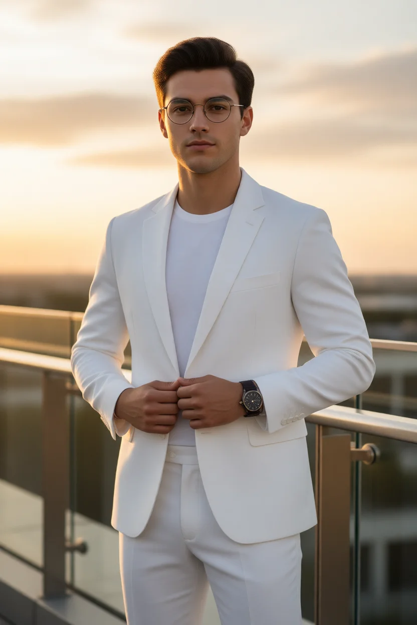 A production-level, cinematic outdoor portrait photograph capturing a person in a reflective moment, set within a vast, serene pastoral landscape of rolling green hills under a soft, overcast, foggy sky. The composition is a medium full shot with the camera at eye-level with the seated subject. The subject is sitting cross-legged on a natural patch of grass, gazing pensively off-camera to the side, wearing a meticulously detailed grey waffle-knit crewneck sweater, brown cotton chino pants, and white leather sneakers. A vintage silver digital watch (Casio-style) is prominent on their wrist. The lighting is completely soft and diffuse, typical of a cloudy, misty day, casting gentle, natural light on the face and textures. The color grading is desaturated and earthy, with muted, natural greens in the hills and a desaturated, cool white sky. The background is rendered with a shallow depth of field, creating a smooth, soft bokeh that emphasizes the subject and adds depth. The textures of the knitwear, the fabric weave of the pants, the grass, and the leather are all rendered with absolute photorealistic precision. USE THE PROVIDED FACE IMAGE AS IDENTITY REFERENCE, ensuring exact preservation of facial features, proportions, skin tone, and likeness. Focus must be critical on the eyes and face, with a natural film grain texture.