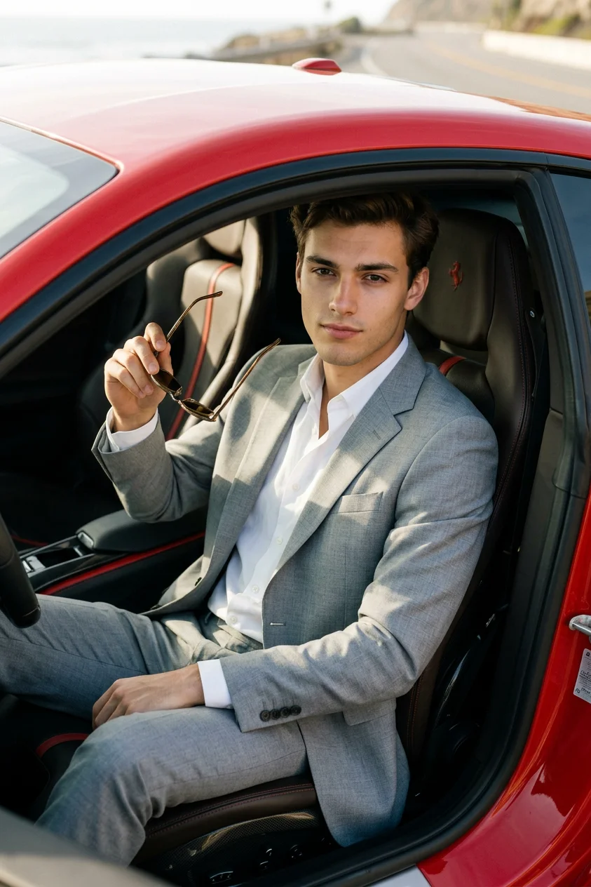 A production-level, cinematic outdoor portrait photograph capturing a person in a reflective moment, set within a vast, serene pastoral landscape of rolling green hills under a soft, overcast, foggy sky. The composition is a medium full shot with the camera at eye-level with the seated subject. The subject is sitting cross-legged on a natural patch of grass, gazing pensively off-camera to the side, wearing a meticulously detailed grey waffle-knit crewneck sweater, brown cotton chino pants, and white leather sneakers. A vintage silver digital watch (Casio-style) is prominent on their wrist. The lighting is completely soft and diffuse, typical of a cloudy, misty day, casting gentle, natural light on the face and textures. The color grading is desaturated and earthy, with muted, natural greens in the hills and a desaturated, cool white sky. The background is rendered with a shallow depth of field, creating a smooth, soft bokeh that emphasizes the subject and adds depth. The textures of the knitwear, the fabric weave of the pants, the grass, and the leather are all rendered with absolute photorealistic precision. USE THE PROVIDED FACE IMAGE AS IDENTITY REFERENCE, ensuring exact preservation of facial features, proportions, skin tone, and likeness. Focus must be critical on the eyes and face, with a natural film grain texture.