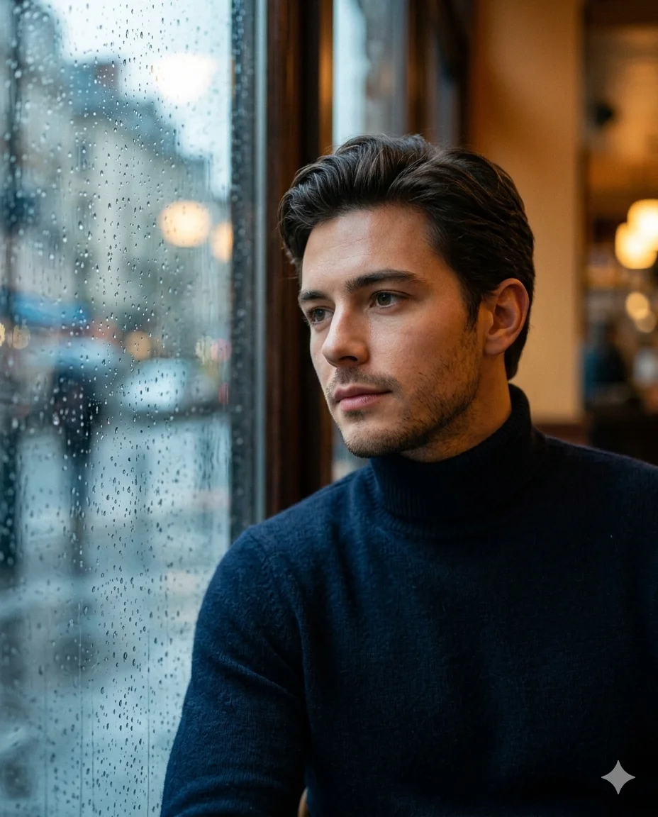 Ultra-realistic cinematic portrait of a man sitting by a rain-streaked window inside a warm cafe, reflective and calm expression, face slightly pressed toward glass, watching blurred city street, dark navy wool turtleneck sweater with detailed fabric texture, warm amber indoor lighting contrasting cold blue-grey rainy exterior, 85mm lens, f/1.8, shallow depth of field, rain droplets in sharp focus on glass, cinematic color grading, soft film grain, high detail, DSLR quality, perfect for Instagram portrait and aesthetic DP, face must remain unchanged from reference image, 4:5 aspect ratio